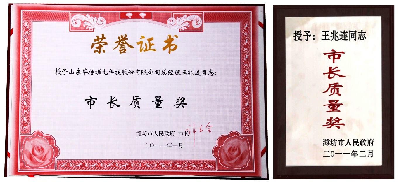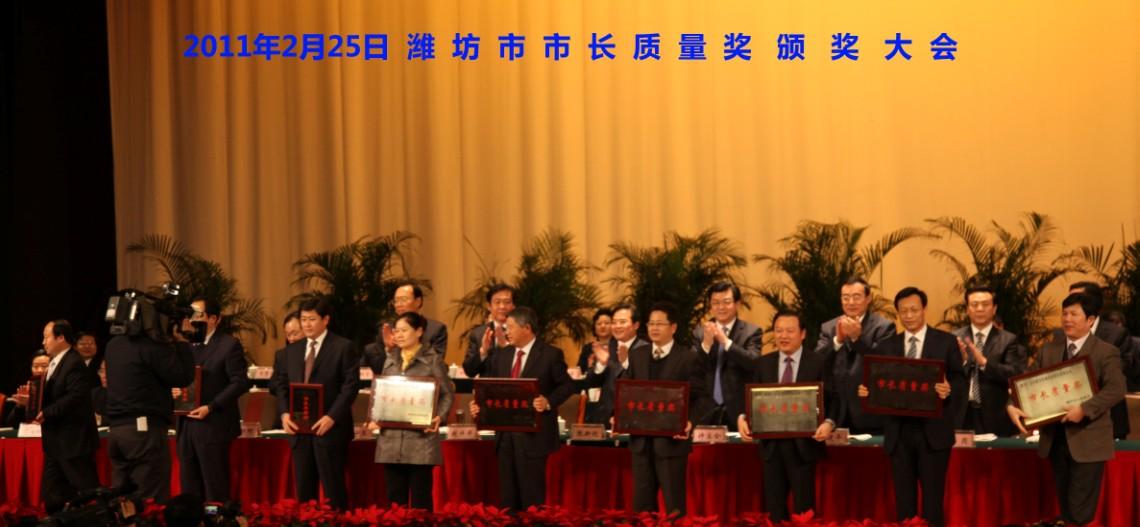 2月25日,在濰坊召開的市長(zhǎng)質(zhì)量度獎(jiǎng)?lì)C獎(jiǎng)大會(huì)上,公司董事長(zhǎng)兼總經(jīng)理榮獲“2010年度濰坊市市長(zhǎng)質(zhì)量獎(jiǎng)”。這是濰坊市最高質(zhì)量獎(jiǎng)項(xiàng)。王兆連董事長(zhǎng)帶領(lǐng)企業(yè)積極推行卓越績(jī)效評(píng)價(jià)準(zhǔn)則等先進(jìn)質(zhì)量管理方法,倡導(dǎo)創(chuàng)建有特色的企業(yè)質(zhì)量文化,強(qiáng)化技術(shù)創(chuàng)新體系建設(shè),推動(dòng)降低消耗、利用資源、保護(hù)環(huán)境,實(shí)現(xiàn)了質(zhì)量效益和可持續(xù)發(fā)展。