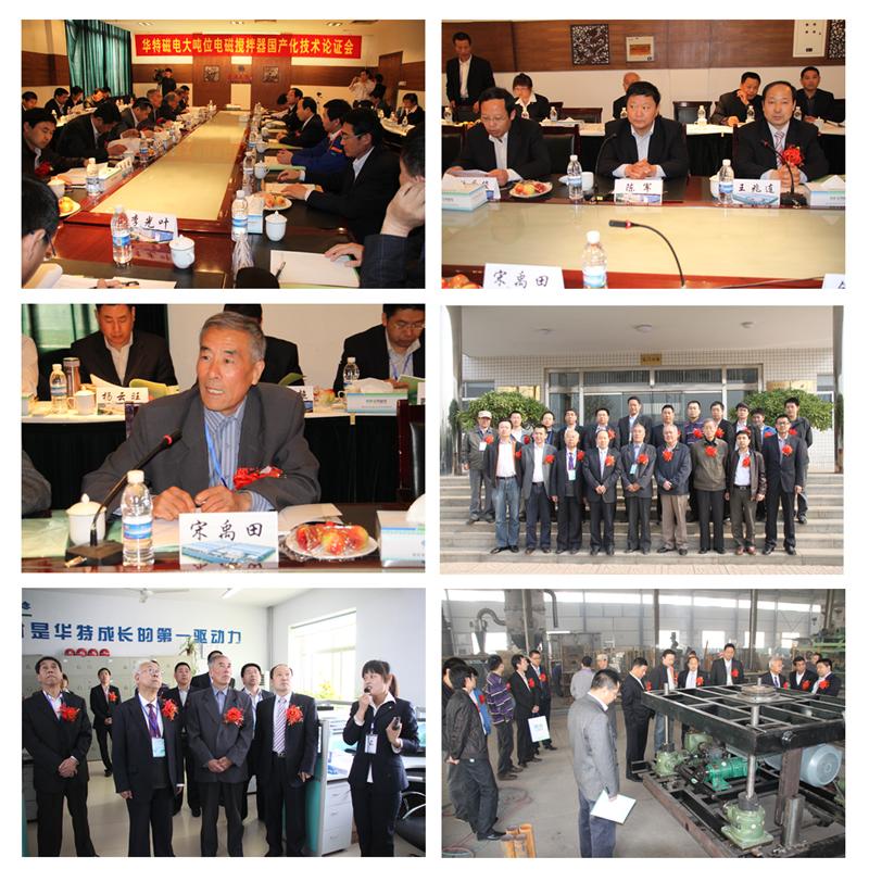 大噸位電磁攪拌器是我公司根據2009年山東省第一批技術創新項目計劃研制開發的新產品。為幫助企業進一步完善產品質量,為用戶提供高性價比的產品,2011年4月23日臨朐縣經信局在臨朐組織召開了產品國產化技術論證會,來自中國有色金屬加工協會、中國資源綜合利用協會、中科院電工研究所、中科院高能物理研究所、山東大學、濟寧學院、蘇州博能爐窯科技有限公司、中鋁山東分公司電解鋁廠、中色科技股份有限公司、河南中孚實業有限公司等十多單位的20多位專家和客戶代表參加了會議。與會專家考察了生產現場,聽取了研制單位的技術匯報,審查了有關資料,經過質詢討論,形成如下論證意見: