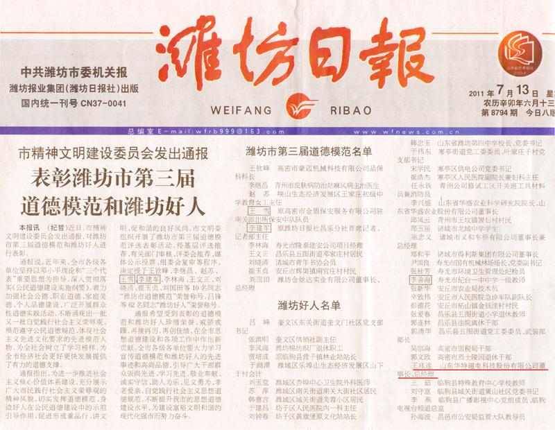 近日,濰坊市精神文明建設委員會發出通報,經基層評選推薦、有關部門審核、評委推薦、媒體公示投票、組委會復審等程序,我公司董事長兼總經理王兆連等62名同志以在重品行、講文明、促和諧等公民道德建設中的引導示范作用,被授予“濰坊好人” 榮譽稱號。