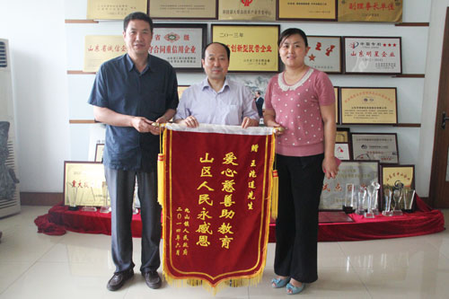 6月5日,九山鎮黨委委員、副鎮長衣燕與九山鎮教管辦領導來公司為公司董事長兼總裁王兆連送來錦旗,上面繡有“愛心慈善助教育,山區人民永感恩”,對王兆連董事長表示感謝。5月28日,縣政協在九山鎮組織召開了“委員進校園,愛心獻兒童”會議,為九山小學建設捐助款項,王兆連董事長捐款25萬元。 王兆連董事長是山東省第十一屆政協委員,近年來帶領企業員工大力開展技術創新,不斷開拓進取,生產經營迅速發展,在取得良好經濟效益的同時,主動承擔社會責任,熱心社會公益事業,不斷捐助款項,為社會作出了積極有益的貢獻。