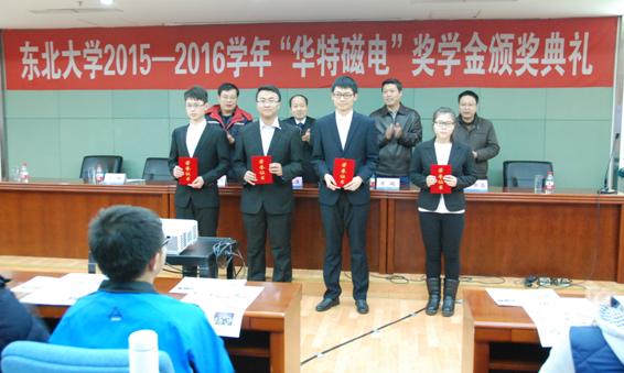 2015年12月25日,東北大學“華特磁電”獎學金頒獎典禮于東北大學漢卿會堂舉行,這是自去年設立華特獎學金以來第二次頒獎。公司董事長兼總裁王兆連、技術中心電器部經理劉世昌、電器工程師張永信,東北大學校友總會、校董會、基金會管理辦公室主任李鶴、資源與土木工程學院黨委副書記兼副院長劉維、獲獎學生及礦物加工工程專業學生代表等參加了會議。