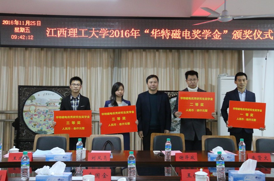 11月25日上午,2016年度“華特磁電獎學金”頒獎儀式在江西理工大學會議室隆重舉行。華特磁電公司常務副總裁劉風亮、綜合管理部經理王建功,江西理工大學副校長李國金、學生工作部副部長劉志剛等領導出席頒獎儀式。